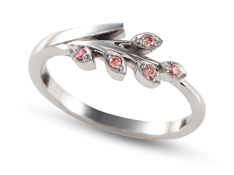 Organikus, vékony faágat megjelenítő fehér arany eljegyzési vagy női gyűrű 5 db pink gyémánttal díszítve.